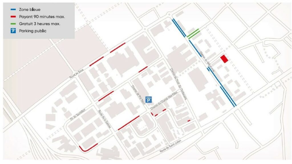 - Rte. du Vélodrome : stationnement zone bleue (60 min. max.).